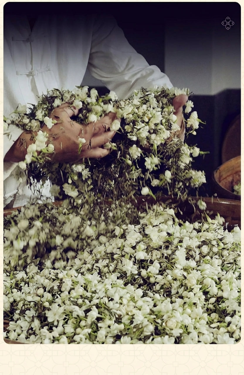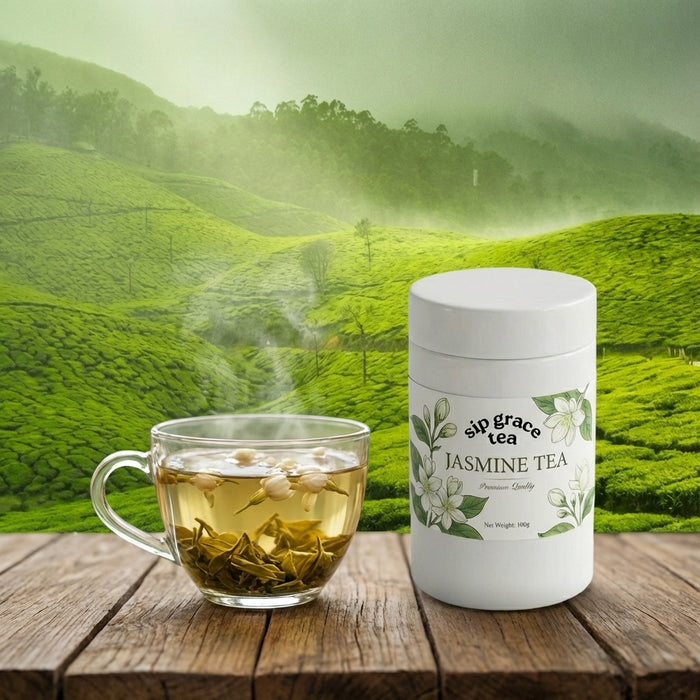 Jasmine tea is a scented tea made by infusing high-quality green tea leaves with fresh jasmine blossoms. The tea naturally absorbs the floral aroma, creating a smooth, fragrant, and refreshing cup.